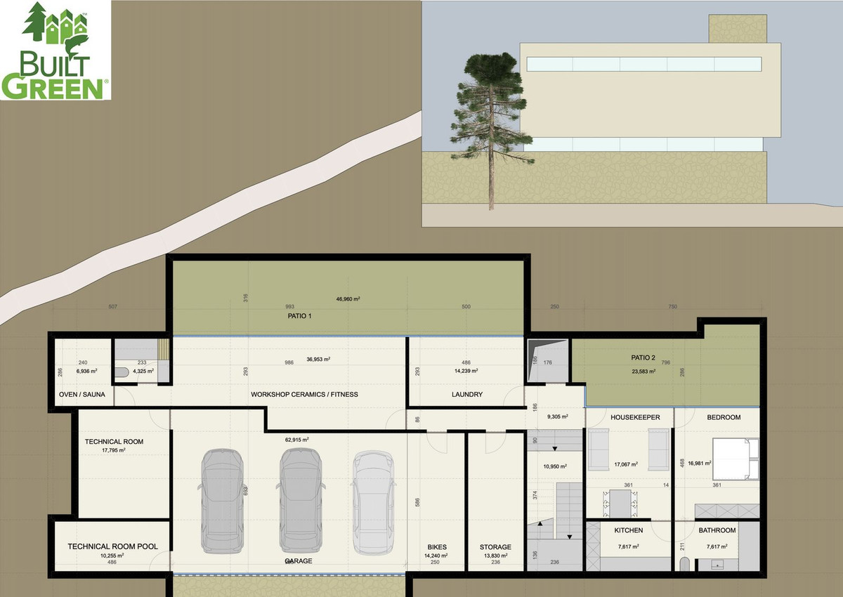 Basement: elevator, garage for 3 cars and motorbikes, sauna, guest toilet, 2 technical rooms, fitness/workshop room, storage room, laundry room, hall with staircase, housekeep quarter with kitchenette and a double bedroom with ensuite bathroom, 2 patios.