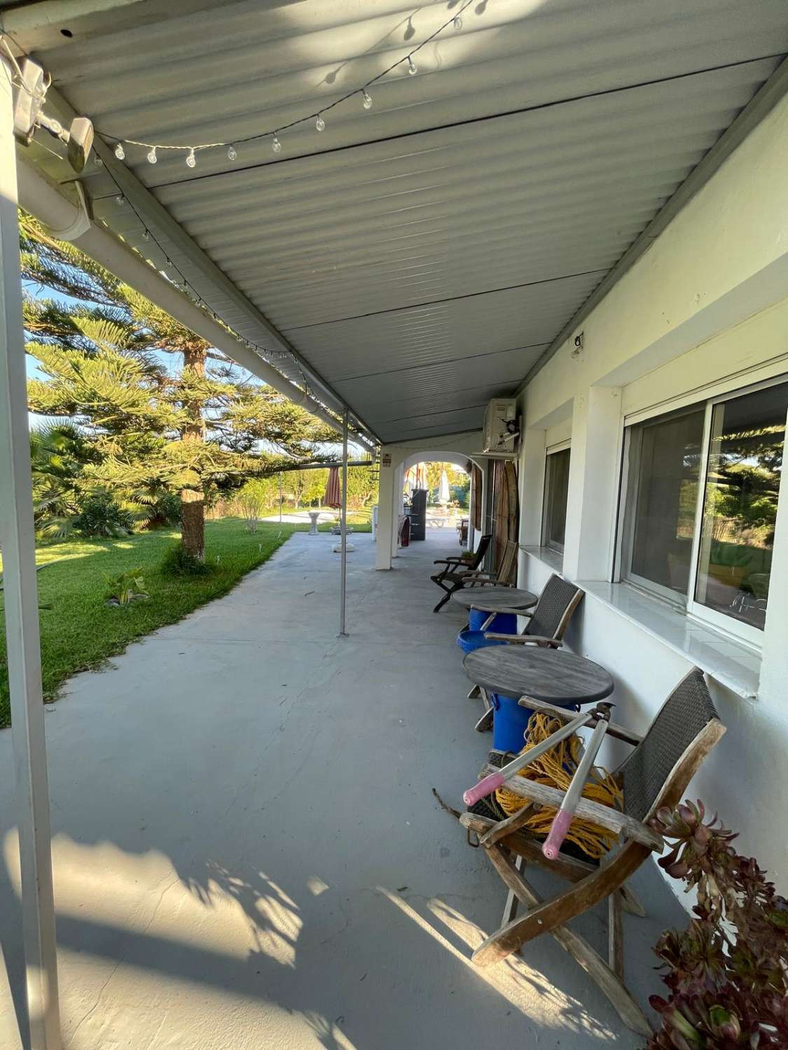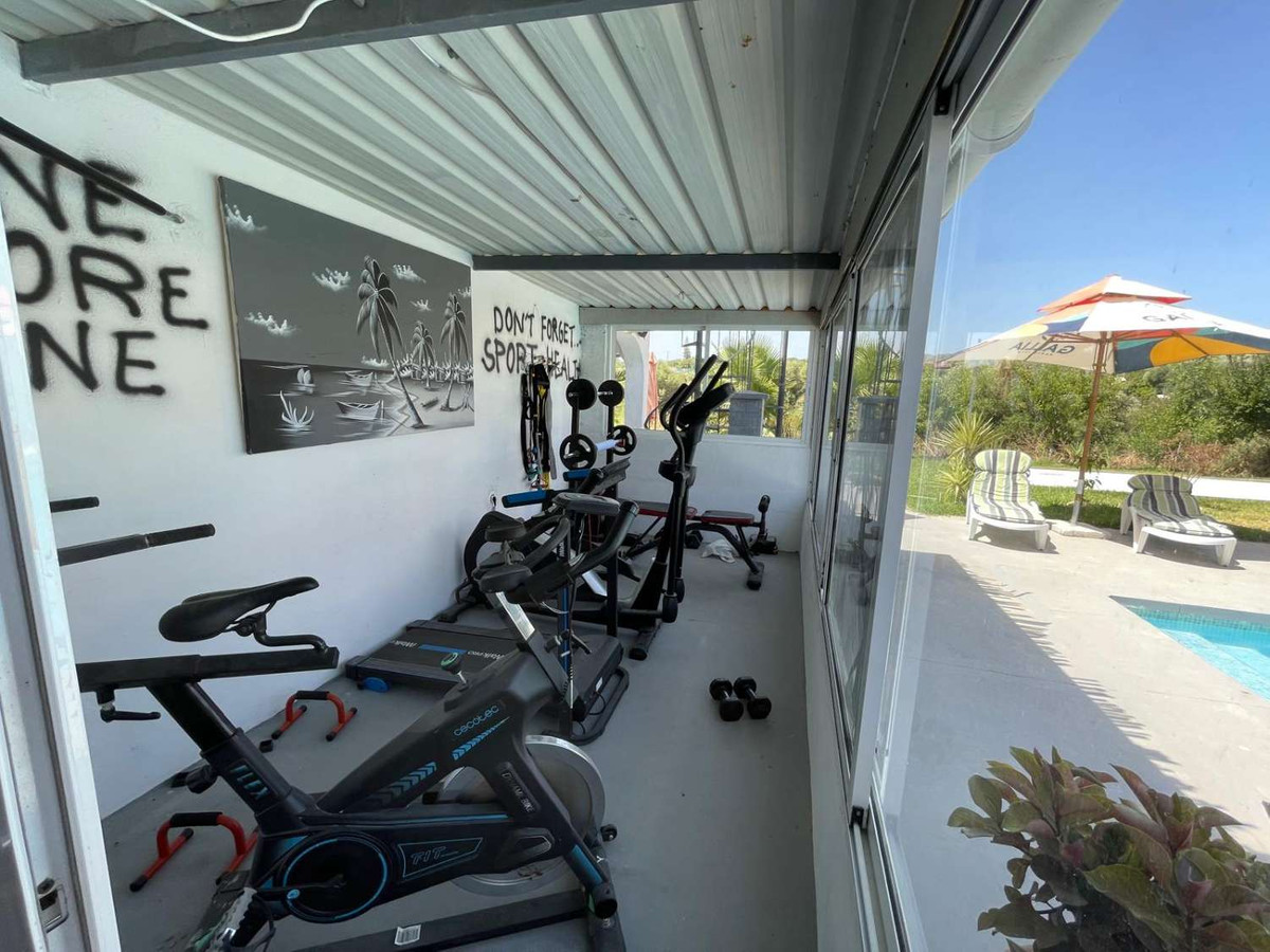 The villa consists of a spacious and bright living-dining room with a fully furnished open-plan kitchen, 4 double bedrooms, 3 bathrooms, several terraces, as well as a covered BBQ area and a splendid saltwater pool. The villa has a gym, a chill-out terrace, a laundry room, air conditioning throughout the house, double-glazed windows, an automatic gate, and a fully renovated house with high-end materials, several parking spaces are available on the plot. The apartment has its own separate entrance, providing more privacy if you want to rent it out. It consists of a living room, kitchen, one bedroom, and a bathroom, as well as a small enclosed patio. The entire property is supplied with electricity via 16 solar panels with a power output of 8.8 kW/h, in addition to mains electricity. The water supply is from a community well. The property has a 10,000-liter water cistern and three 1,000-liter tanks. The property also has a wide variety of fruit trees such as orange, avocado, pomegranate, fig, and mandarin trees, among others.