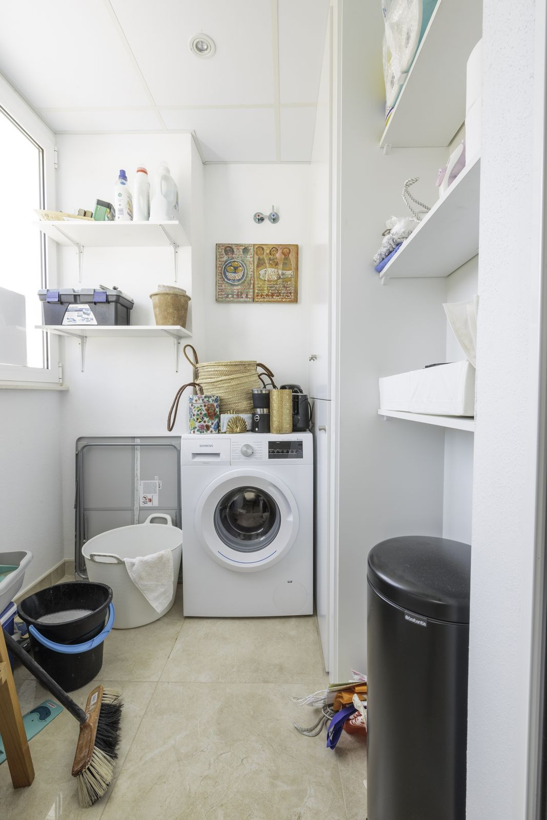 Back on the first floor, the laundry room is separated from the kitchen by a door, with space for storage (like a pantry), and a washing machine is located there. There is additional storage under the stairway. All appliances are Siemens brands. The penthouse features a highly efficient aerothermal central cooling/heating system with independent thermostats in the living room and bedrooms, and heated flooring in the master bedroom and bathroom on the second floor.