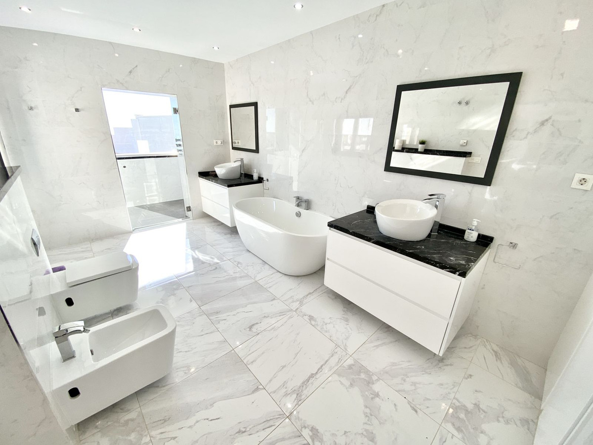 This stunning 5 bed, 5 bath villa for sale in Benalmadena Pueblo also offers a separate self contained area currently used as a 1 bed apartment and has been fully refurbished to a very high standard throughout. The villa offers a large lounge / diner with modern box coving, concealed lighting and spotlights. This lovely living area offers lots of natural light from 3 sets of large patio doors which lead onto the outside entertaining / swimming pool level. Modern open plan white high gloss fitted kitchen with both base and full height cupboards incorporating luxury Bosch appliances, including; 2 x ovens, microwave and coffee machine. Dark granite luxury work top and splash backs with fitted sink, large Bosch gas hob & hood. Window overlooking pool / sea and modern box coving with concealed lighting and spotlights. Cloakroom / w.c and stairs to first floor landing.