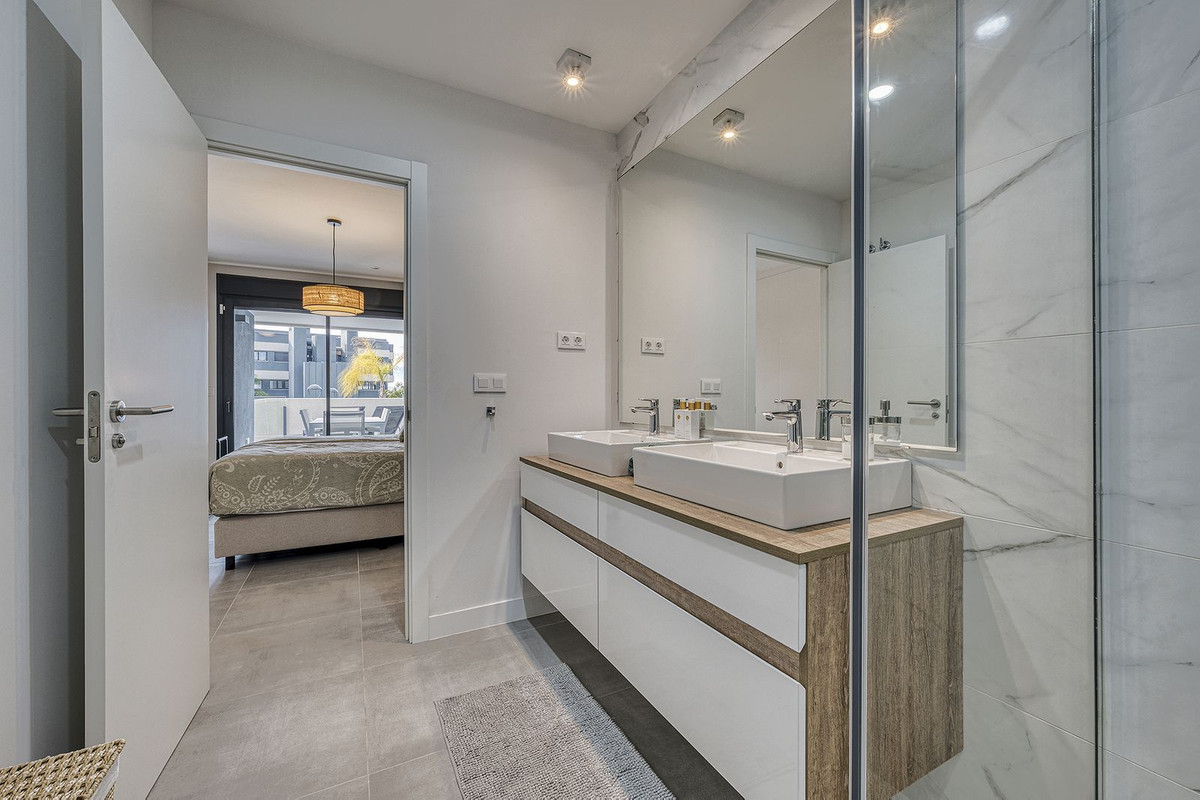 Dit elegante appartement met 2 slaapkamers en 2 badkamers bevindt zich op de eerste verdieping van een modern wooncomplex in La Resina Golf, Estepona. De woning beschikt over een ruim terras van 31 m² met een prachtig, open uitzicht over de tropisch aangelegde binnentuin, wat zorgt voor een rustige en ontspannen sfeer.